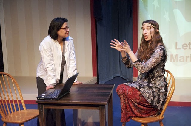 In Through Delhi, Gale (Duarte) has employed technology to create an avatar of Blossom (Marquis), her mother, an aging hippie dying of a progressive fatal illness, to allow a final negotiation to resolve outstanding questions about their lives together. Well-written, a serious discussion between mother and daughter ensues as Duarte tries to come to terms with her mother’s life choices. Nicely timed humor punctuates the discussion clarifying Blossom’s position, to save the children of the world, or at least in India. Marquis clearly has fun swooping about in colorful “hippie” garb, Duarte playing the perfect foil for Marquis’ sometimes manic exposition.