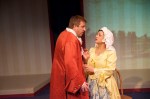 The Last Arawak begins in a serious “real-life” vein with Brother Diego (Wright), Bishop Bartolome de Las Casas (Newton), and Lucaya (King) discussing the current state of colonization and conversion, though the dialog in this section is cumbersome and drags. Then, injured, Newton loses consciousness, and falls into a dream. Following a transformation, with appropriate costume changes, Columbus (Wright), and the Pope (King) are very funny, picking up the pace with rapid-fire dialog laced with anachronistic humor as they help Newton sort out the right course of action. The reverse transformation has a particularly nice bit of staging and costuming, with Wright reversing his cape with a flourish to again become Diego, and King changing back to Lucaya on stage.
