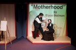 Johnson’s set consists of two platforms, essentially bisecting the stage, with a small center gap for entrances and exits. Play-specific projections on the house right platform back provide introductory titles and differing scenes for each of the plays. Prop additions including tables, chairs, an easel in Motherhood, crates, and even crime scene tape in Showdown help bring the audience into the appropriate frame of mind.
