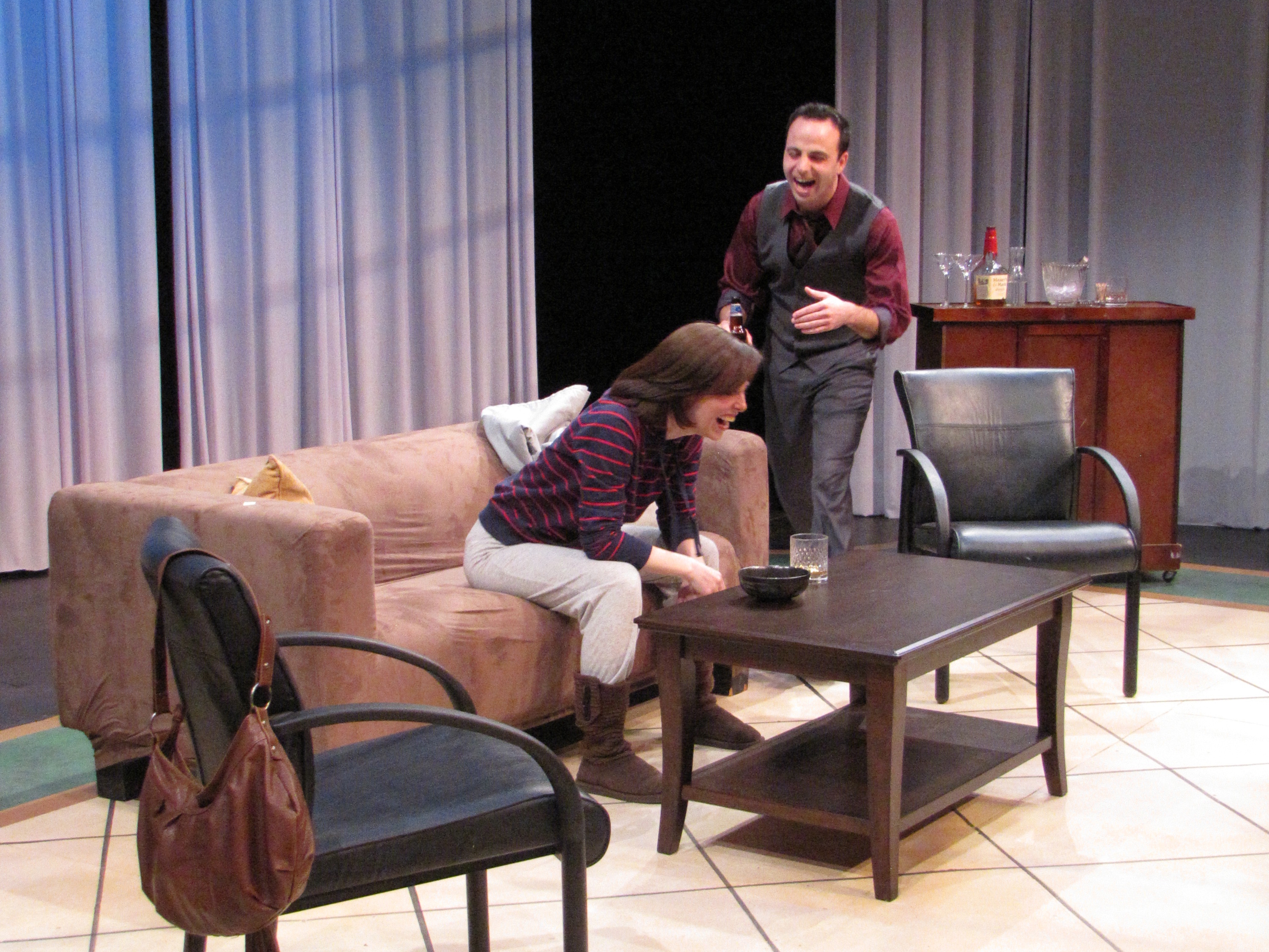 The play begins in a Korean restaurant in Washington D.C. where McGrath and Psarras appear to be Ilona Waxman and Dan Ferris discussing their relationship over dinner, although we later realize they are really Alma and Avery, and this is our first exposure to their role playing. At first, McGrath is very stilted and over exaggerated in her diction and is not really believable. As the discussion continues, she eventually breaks into uncontrollable, hysterical laughter, and at that point, she seems more real. Psarras as Ferris is a little dry, and he uses a Southern inflection in his diction.