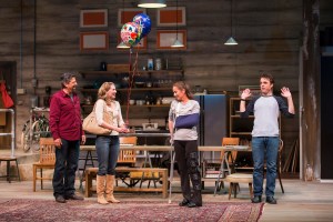 Scenic Designer Erik Flatmo’s unit set brings the audience into James and Sarah’s loft, from the stained glass window framed by a brick façade covering the stage right wall, to the distressed wood on the inside wall upstage sporting built-in shelving, a refrigerator and closets further defining the space. The furniture is believable and shows a good eye for style. Two bicycles stowed near the door complete the picture. A large flat screen TV appears near the couch during intermission.