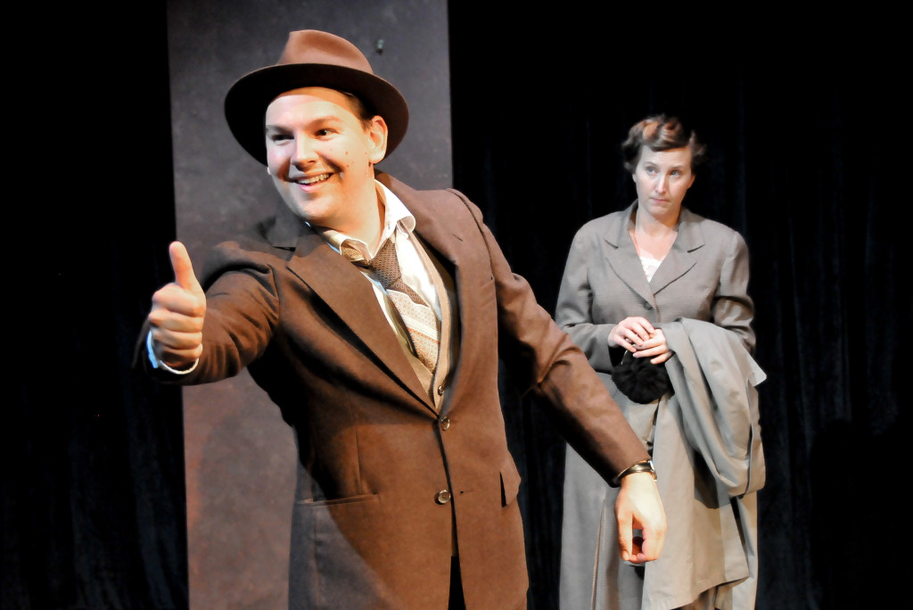 Charles McKeithan’s scenic design is sparse, but very fitting for the story. A small, central platform with several chairs serves as the bus. Aided by Valerie Clear’s lighting design and Clark’s stage direction and sound design, a few additional props are used to transform between terminal, restaurant, and bedroom smoothly under a period-appropriate selection of songs making the changes seem very quick. The songs used for scene changes are from the era, though slightly after the year the story takes place. For instance, “Caravan” wasn’t written until 1936, and “Blue Moon” while closer, was written in 1934.