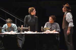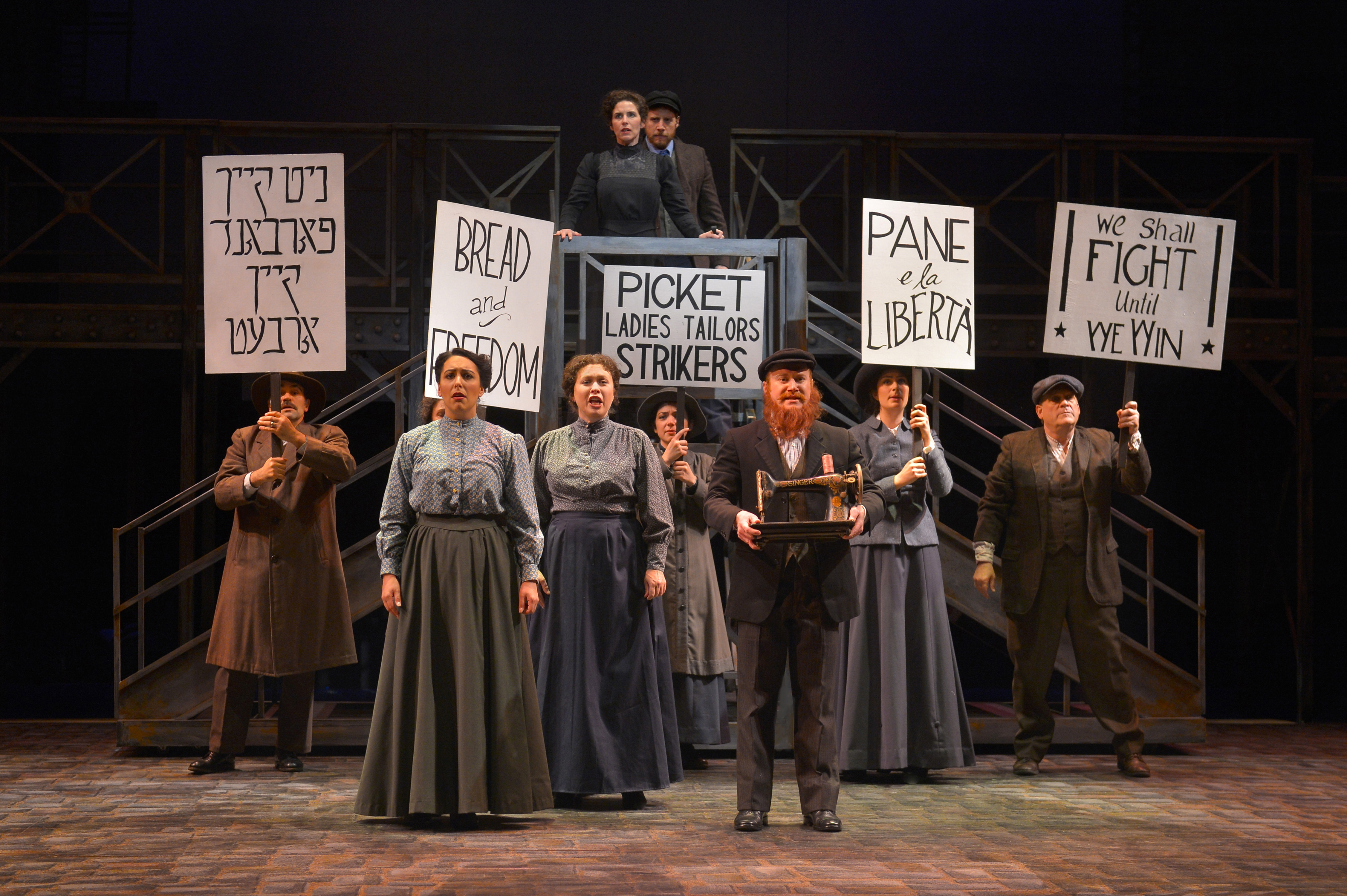 Hints of building façades with lit windows and physical railings slide in and out of scenes as appropriate to show the tenements in the surrounding area. Short platforms smoothly slide actors and props in and out to represent a sweatshop or dwelling accoutrements, and street vendors roll their carts into their scenes seamlessly. As one can expect from a TheatreWorks production, the set movements are choreographed beautifully, occurring without breaking the action except for the scheduled intermission.