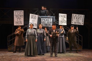 The other exception to the Act 1 anthem motif occurs in “Penny a Tune.” This is a delightful Klezmer number showing the vibrant activity and comradery evident between the street vendors in this immigrant community. The music is lively and very ethnic, and some wonderful clarinet work stands out. The staging is slightly off though. Two actors dance with a clarinet and a violin, but they don’t convincingly match the music which can cause a little cognitive dissonance for those with the appropriate musical training watching the action.