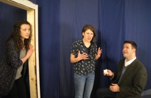 The evening starts with For Art’s Sake. This scene begins well-grounded in a comfortable reality, rather academically in a museum. Whismore plays Mona, an aging art history professor, talking with her technologically oriented son (Weiland) about her lot in life, and her concerns about his. After an animated, somewhat humorous discussion analyzing an antique painting from both the artistic and analytic perspectives held by Mona and Art respectively, Mona leaves, and Art remains. From there, the scene shifts into a more fanciful tone with Mitchell assuming a rather prominent role. The story, and its ensuing banter is engaging throughout, and all three actors interact with intensity and care.