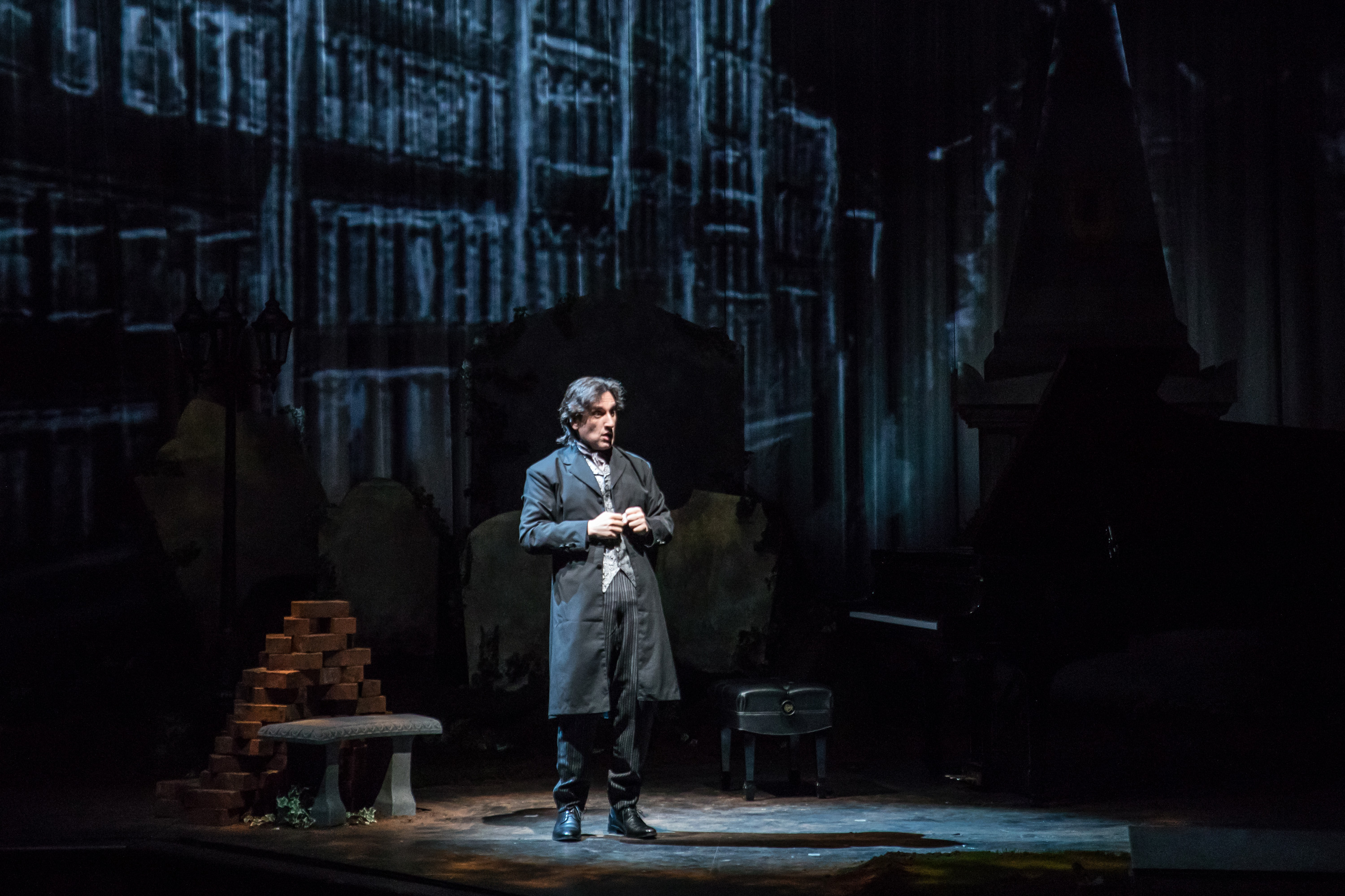 The action takes place in October 1863 Vienna. It is set in a graveyard surrounded by artfully placed tombstones, a shovel, some dirt, bricks that had previously covered a metal box, and a Steinway grand piano center stage. Felder’s set is gorgeous, and Christopher Ash’s lighting and projection design add greatly to its effect, both in the graveyard itself with a very realistic background, and in flashback sequences taking the audience into the city or inside various structures with all the accoutrements. Some abstract projections also come into play, enhancing the tone of a given scene. The lighting and upstage sections of the set give the production a subtle, and slightly spooky, antique feel in various shades of gray.