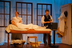 Kathleen O’Brien’s costumes are detailed, period appropriate, and exquisite. Since part of the action includes a certain amount of disrobing (though modesty is mostly preserved), all of the layers of clothing of the period are in evidence. Per the playwright’s script notations, part of the concurrent timing of the action is dependent on either dressing or undressing in the exam room whilst the discussion continues in the living room. In this way the layers are sort of time keepers ensuring the pacing and synchronization of the action, assuming of course that the actors have mastered the intricacies of navigating around corsets, bustles, petticoats, and other period-specific clothing impediments.