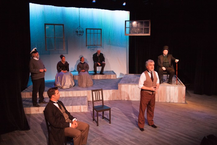 Norm Beamer’s scenic design is sparse, but effective. Three window frames hang upstage giving some perspective to the rooms, whether they be in the doctor’s house, the newspaper offices, or the captain’s “barn of a house” serving as a meeting hall. A multilevel platform spans the stage, providing an interesting performance space for each locale. When in the doctor’s house, the platform levels effectively separate the rooms. In other settings, the levels allow for focus and authority to come through. Straight-backed chairs are set in each location/room. Because of the levels, even minimal furniture/prop movement requires somewhat extended scene changes.