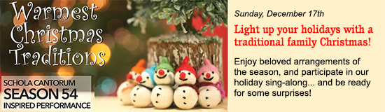 The second not-to-be-missed music event is Warmest Christmas Traditions presented by Schola Cantorum on Sunday, 17 December 2017, at the Mountain View Center for the Performing Arts. The official choral concert begins at 3 p.m. on the mainstage, and a special pre-concert lobby musical event begins at 2:30 p.m. and returns at intermission.