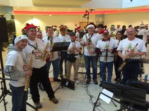 What is San Jose Saxophone Christmas you might ask? It is the day when over 200 saxophone players gather together to play holiday music. Last year, there were 218 players. Another recent year there were 221, but the record so far was 224. The players of all shapes, sizes, and ages range from musicians just starting out to professionals who have been playing for many decades. And the saxes they play include some not seen elsewhere ranging from a soprillo sax, the tiniest commercially made saxophone in existence, to the contrabass, the biggest saxophone made, along with everything in between.