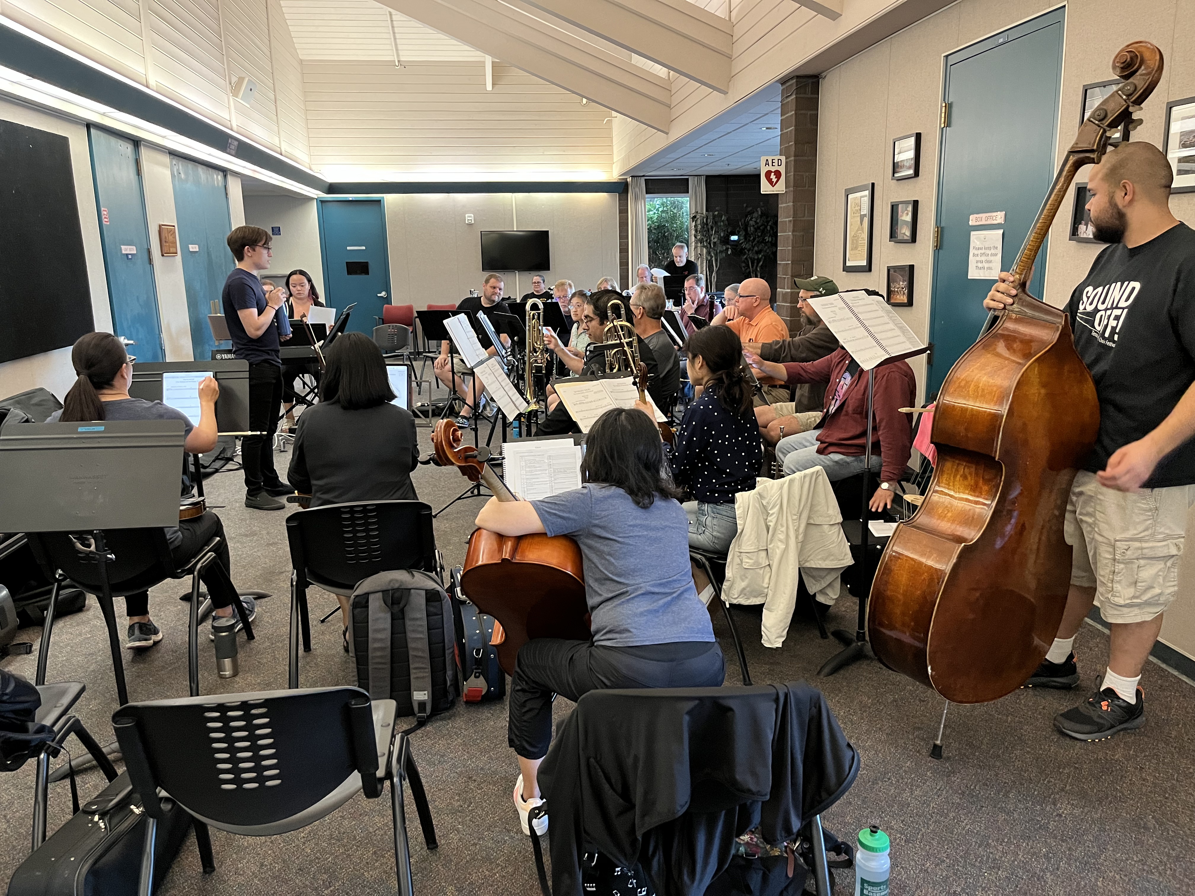 Note that while performances will have 20 players with one player per part, this rehearsal had a much fuller string section. Several string players are splitting the run, so with everyone there the violin and cello parts were doubled and able to take advantage of their divisi lines. There were also two French horns this one night only which was lovely to hear.