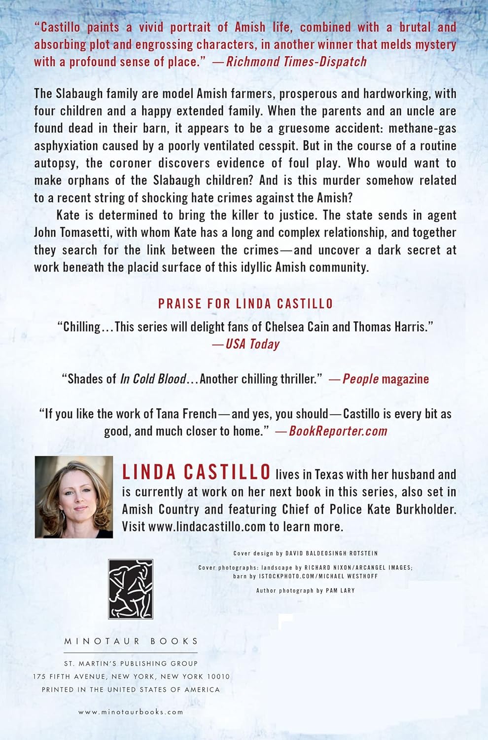 As with earlier books in the series, Castillo delves deeply into the workings of the Amish community bringing to light their reluctance to help the police because the police are outsiders. Even with Kate having grown up in the Amish community, they are skeptical. There are also further complications as they get deeper into the investigation that show that the family facing the tragedy has secrets and that the Amish are not immune to challenges stemming from normal curiosity that can sometimes grow into deviant behavior within a household. Not all is at it seems at the outset, but then it wouldn’t be a Castillo murder mystery without such complications.