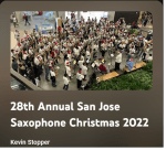 (Published 18 December 2022): San Jose’s Saxophone Christmas (or SaxMas) is an annual tradition bringing sax players together to share in the joy of making holiday music together for a one day extravaganza. 2022’s event happened on 17 December, and this piece records that festive event. Included is link to the video playlist of the last concert of the day taken by Kevin Stopper.
