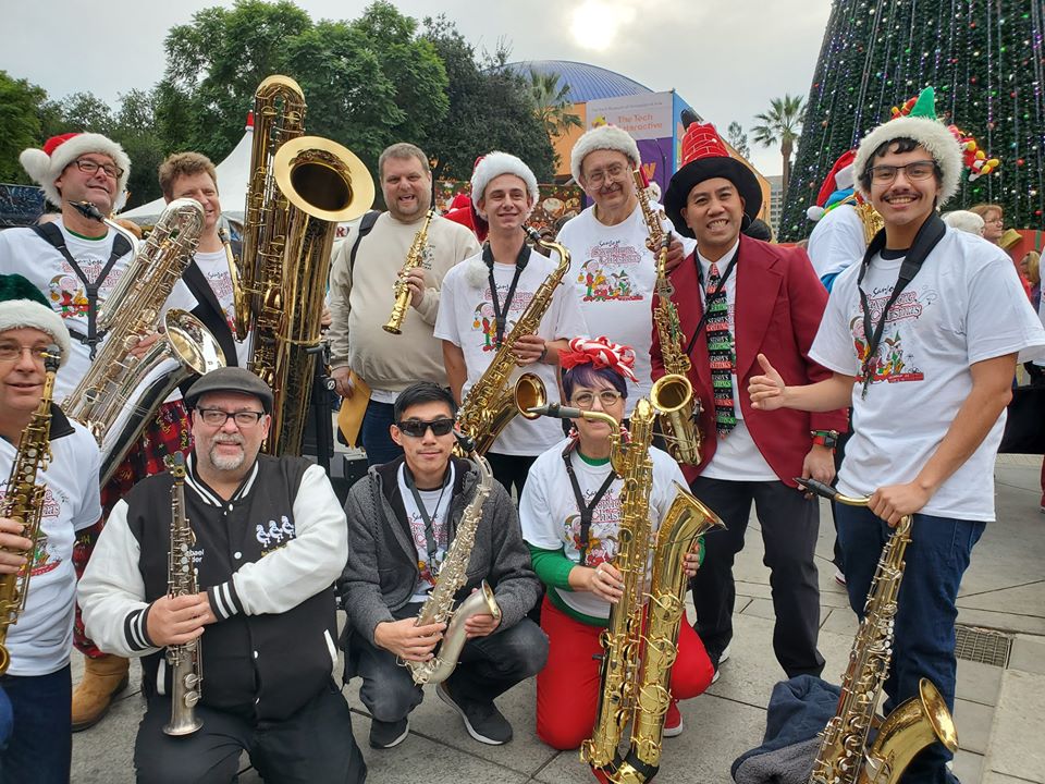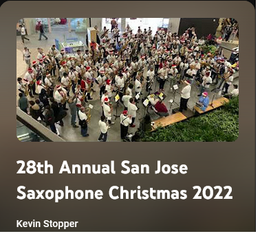 Over the years, I’ve written several articles promoting the annual holiday tradition – San Jose’s Saxophone Christmas (or SaXmas for short). Saxophone Christmas is the brainchild of founder Ray Bernd, a man who is a walking saxophone encyclopedia and strives to bring saxophonists together to share their love of this unique and often misunderstood family of instruments. While not exactly a flash mob in the traditional sense, SaXmas is a one day festival of holiday music to brighten the season. The players gather in the morning to renew old friendships and spend a couple of hours together playing through a set of holiday tunes, most of which are arranged for this momentous ensemble by Ray himself. After a short break, the group then plays two free concerts in the local area that afternoon. Ray always tries to schedule the earlier concert at an outdoor venue, and the second concert at an indoor location. That way even if the weather doesn’t cooperate, there will be at least one concert, and with any luck, two. The San Jose SaXmas is always on the third Saturday of December. This year that puts the 29th annual event on 16 December 2023. The San Jose SaXmas concerts will take place as follows: